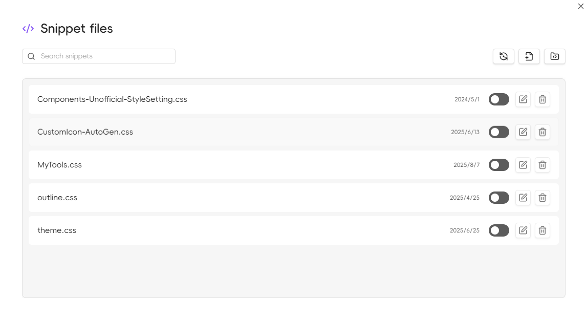 The Ace Code Editor plugin provides convenient CSS snippets management functionality, allowing you to create, edit, and manage custom styles directly within Obsidian.